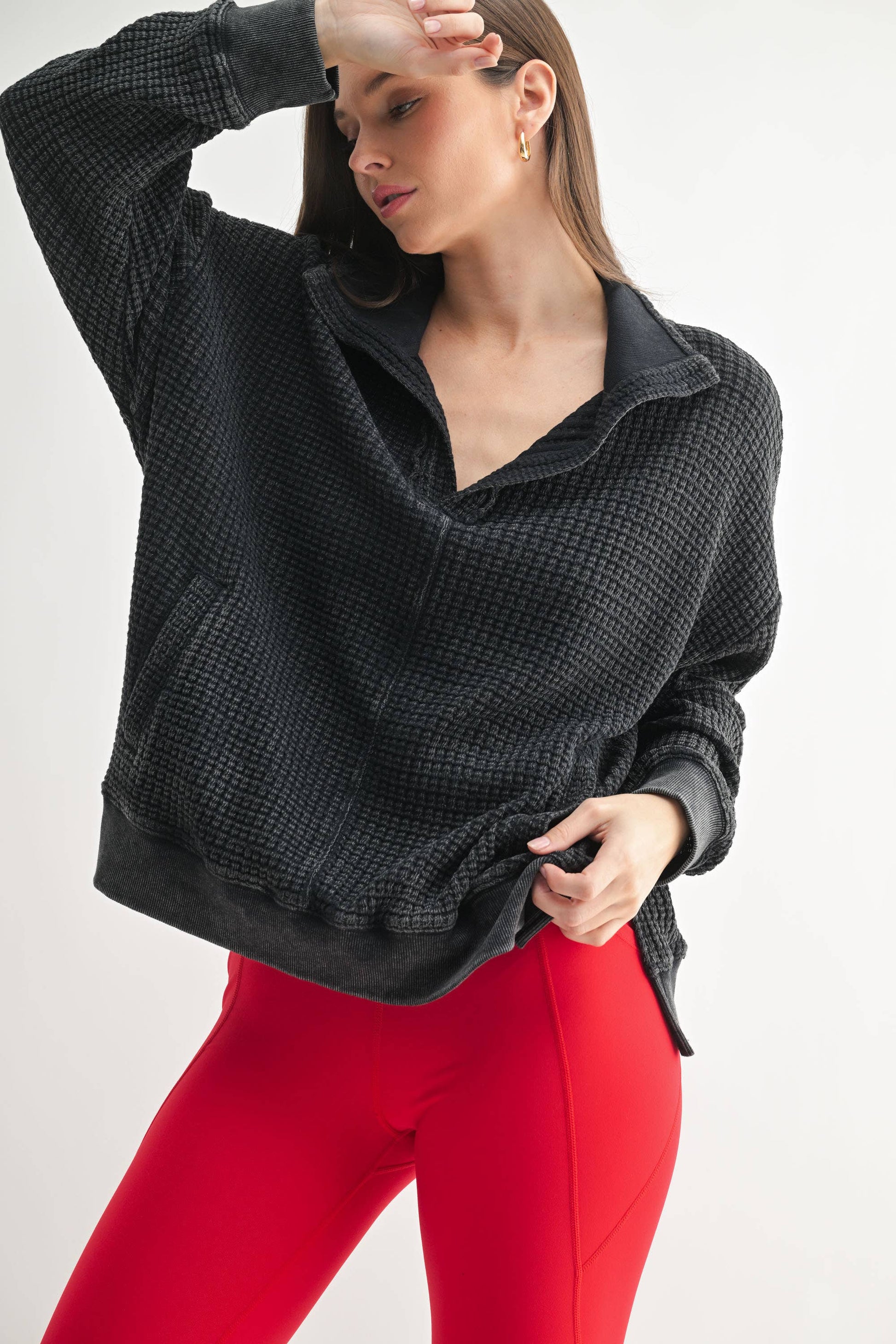Effortlessly cool and endlessly cozy, the Chunky Waffle Mineral Wash Collared Sweater is your go-to for laid-back style. Made from a chunky, textured waffle knit cotton blend, it delivers warmth with a breathable, soft feel. The oversized fit and drop shoulders enhance its relaxed vibe, while the open collar neckline adds a modern, effortless touch. Model is 5'9", a size 2, and is wearing an S 60% cotton 40% polyester